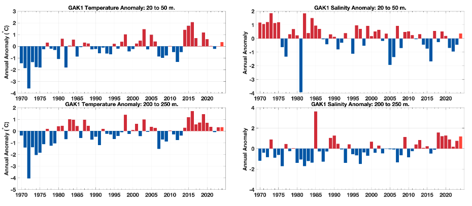 Long-term observations at station GAK1 continue to show clear changes in the physical structure of the northern Gulf of Alaska. Over the full record, the water column has warmed, with stronger warming near the surface than at depth. At the same time, surface waters have become fresher while deeper waters have become more saline, resulting in little overall change in total freshwater content but increasing vertical stratification—particularly during late winter and spring.