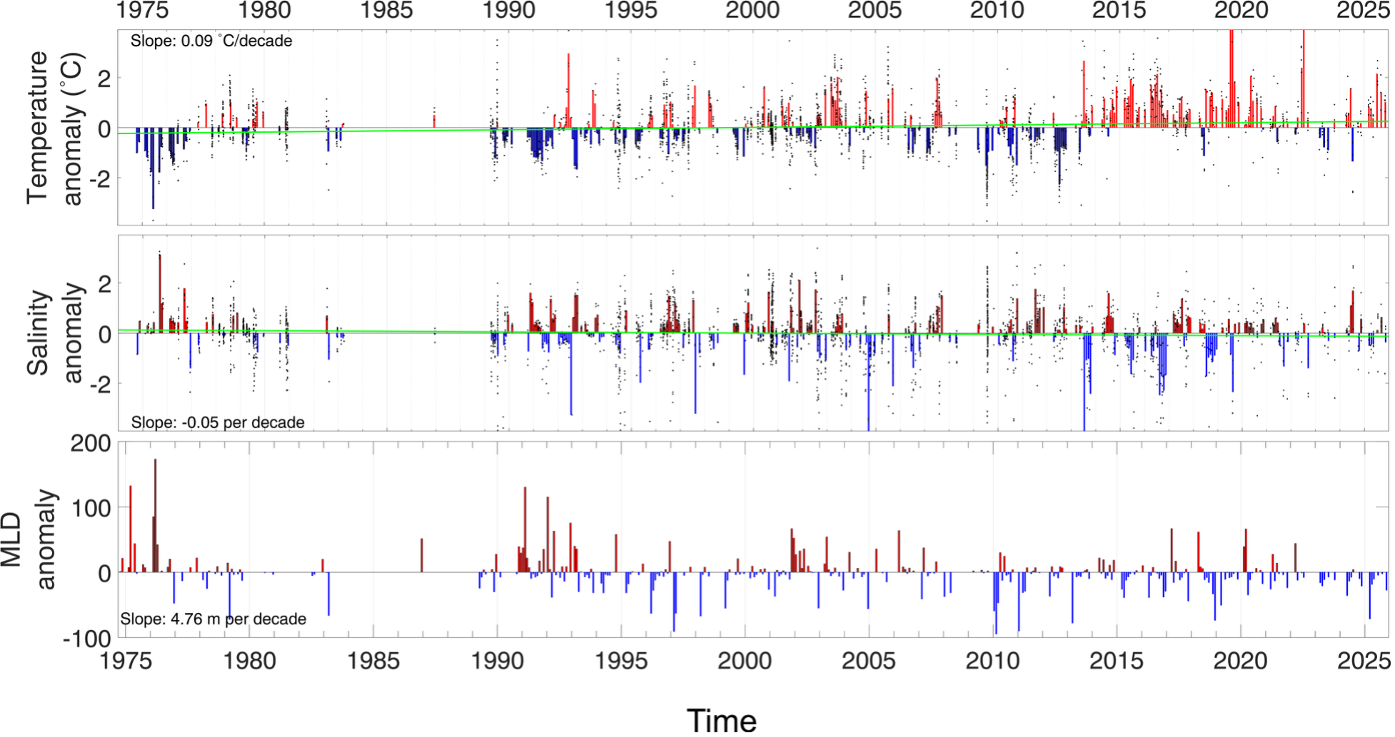 Long-term monitoring in Prince William Sound shows continued changes in ocean conditions, including warming surface waters, increasing freshwater input, and a thinning surface mixed layer. Near-surface temperatures have remained mostly above average since 2013, with periodic marine heatwave conditions, while surface salinity shows a long-term freshening trend. The depth of the surface mixed layer has declined over time, likely driven by warming and increased freshwater input. A shallower mixed layer limits the amount of nutrients available in surface waters, which may influence overall productivity.