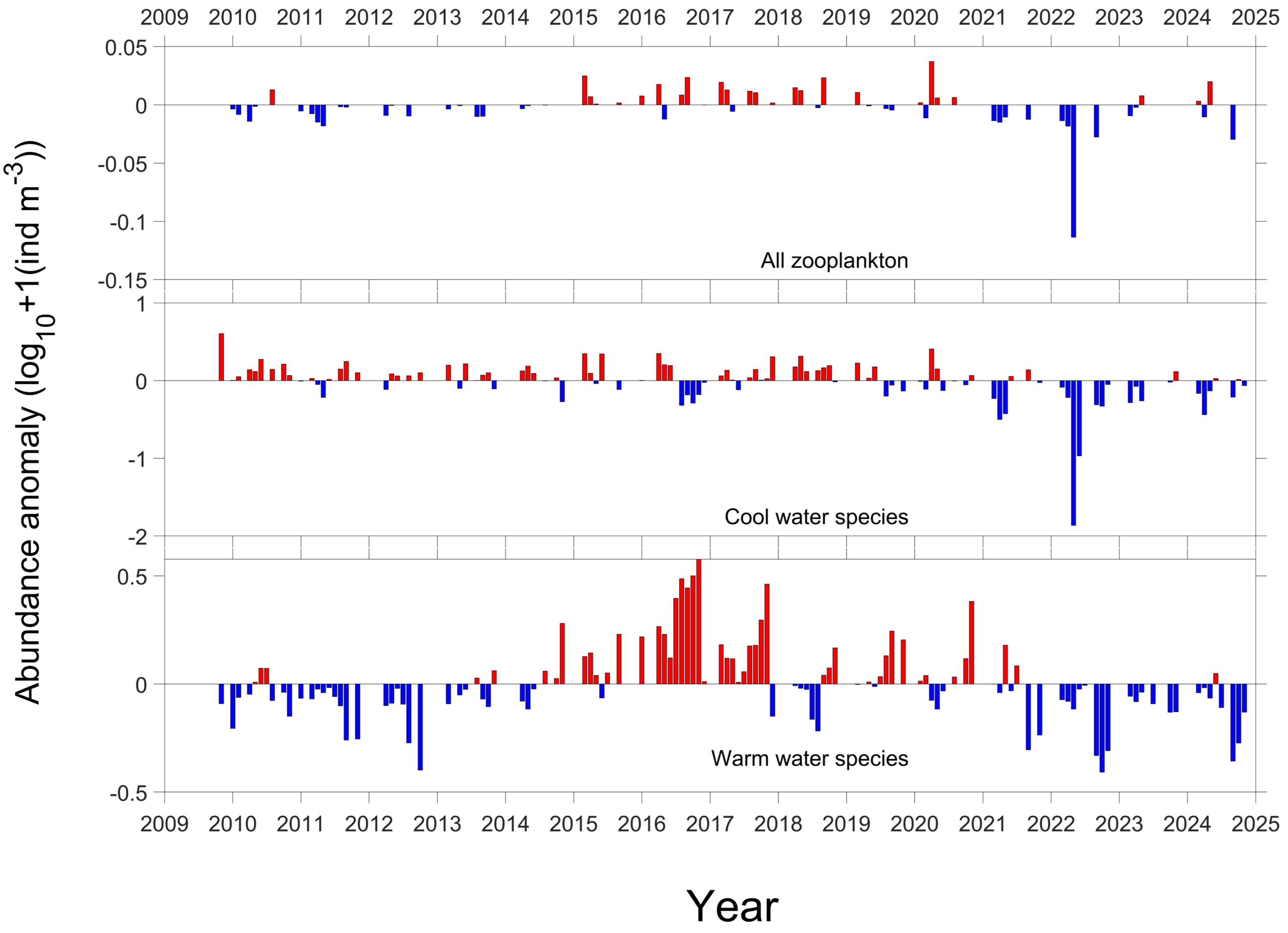 Zooplankton communities have also shifted in response to changing conditions. During marine heatwave periods, warm-water species increased while cool-water species declined, with a return toward cooler-water assemblages following cooler periods. In recent years, overall zooplankton abundance has trended below average.