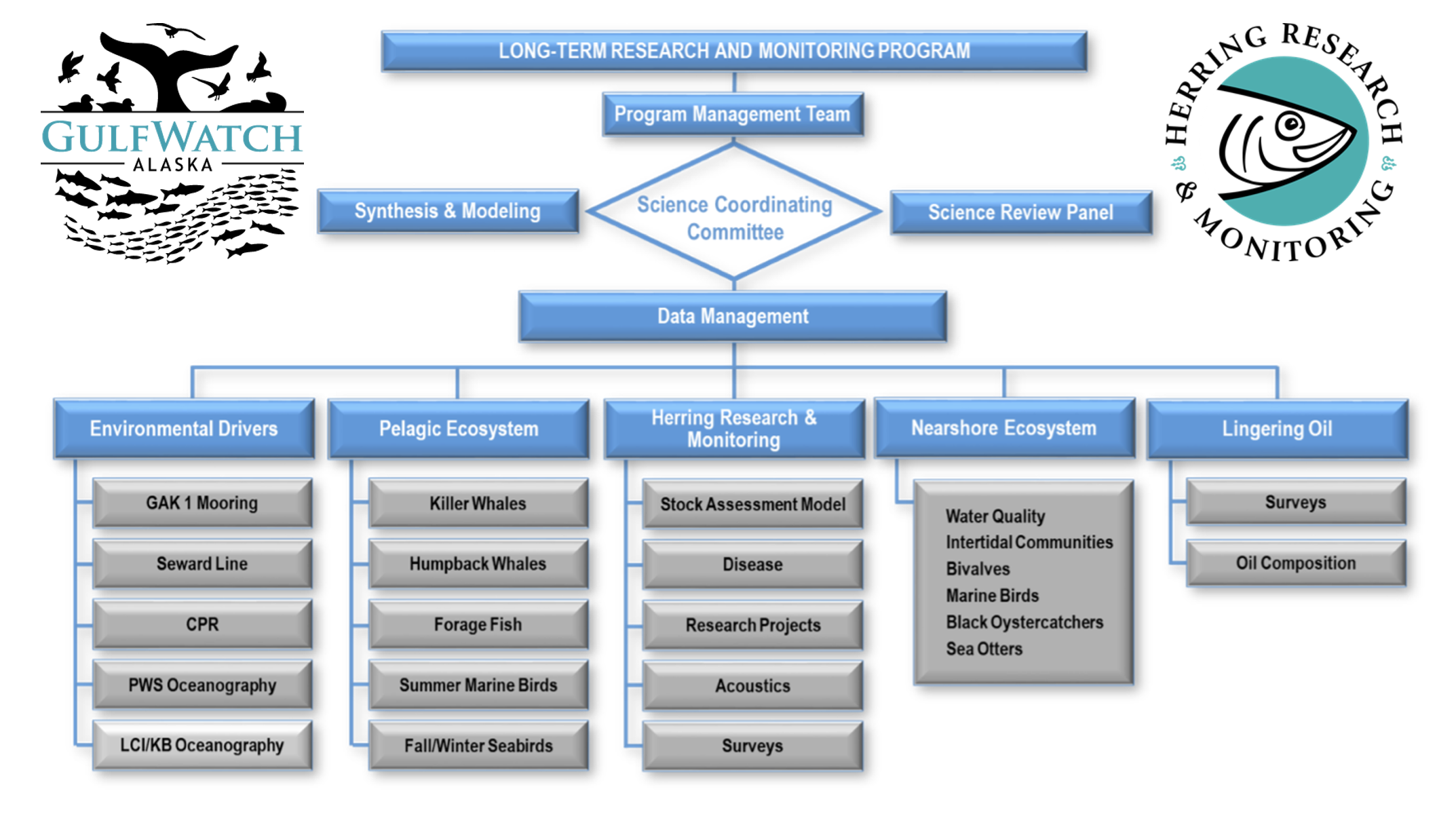 Four teams work in concert to provide integrated program oversight, outreach, science review, and coordination for the Gulf Watch Alaska projects.